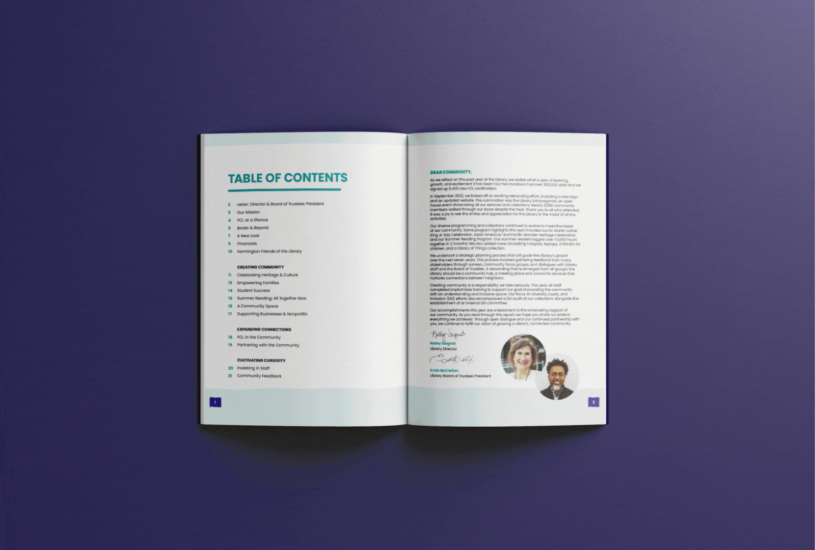 This is a collection of designs created for the Farmington Community Library ranging from general illustrations, flyers, annual report, animated logo, social media posts, and merchandise.